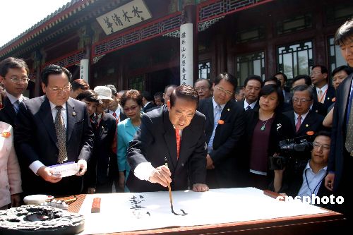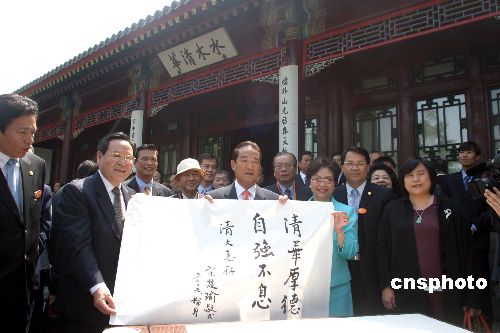 五月十一日上午,亲民党主席宋楚瑜在清华大学发表演讲,演讲结束后,亲民党主席宋楚瑜率亲民党大陆访问团清华大学的主要景点和经典建筑并题写“清华厚德自强不息”。作者:张勤
