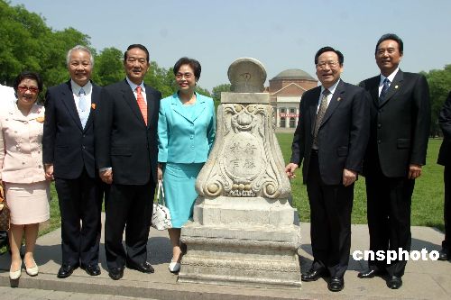 五月十一日上午,亲民党主席宋楚瑜在清华大学发表演讲。之后,亲民党主席宋楚瑜和夫人等参观了清华大学的主要景点和经典建筑,并与中台办主任陈云林(右一)、清华大学校长顾秉林(右二)在日晷前合影。作者:张勤