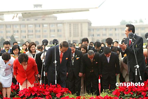 五月十三日上午,亲民党主席宋楚瑜结束了九天八夜的大陆之行离开北京,在发表临行感言后带领全体亲民党大陆访问团团员鞠躬致谢。作者:廖文静