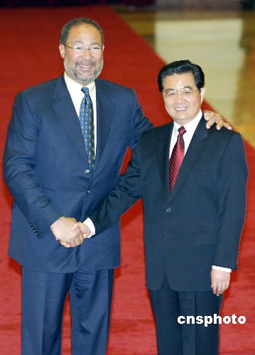 五月十六日晚,二○○五北京《财富》全球论坛在北京人民大会堂开幕。中国国家主席胡锦涛在开幕式前会见参会的VIP嘉宾,图为与时代华纳公司董事长理查德·帕森里握手。作者:廖文静