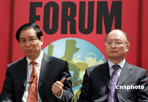 2005北京《财富》全球论坛5月18日专门举行“中国银行业改革近况”会议,中国银监会主席刘明康(左)、国家开发银行行长陈元用娴熟的英语坦诚地与世界各国业界人士对话。作者:任晨鸣