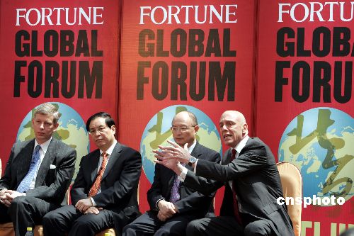 在北京举行的2005《财富》全球论坛5月18日专门举行“中国银行业改革近况”会议,中国银监会主席刘明康(左二)、中国国家开发银行行长陈元(右二)用娴熟的英语坦诚地与麦肯锡公司亚洲区董事长鲍达民(左一)、安永会计师事务所合伙人罗德曼(右一)等人对话。作者:任晨鸣