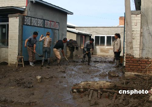图:洪水过后沙兰镇居民清理门前淤泥