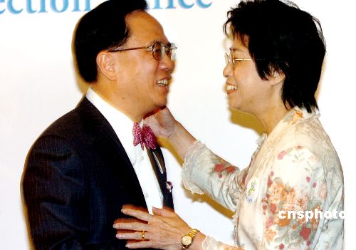 曾荫权在16日晚的记者会上与夫人相拥祝贺。