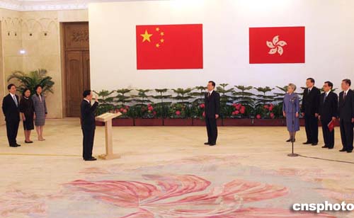 中新网6月24日电 香港特别行政区行政长官曾荫权宣誓就职仪式今天上午在人民大会堂香港厅举行。