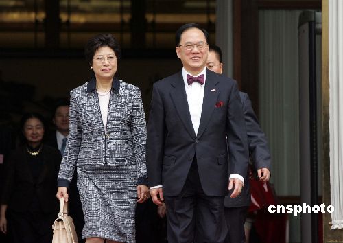 香港特区行政长官曾荫权六月二十四日在北京人民大会堂香港厅宣誓就职。曾荫权在完成就职宣誓仪式并与温家宝总理会见后,喜气洋洋走出人民大会堂。作者:毛建军