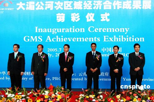 七月三日,大湄公河次区域经济合作(GMS)成果展在昆明国际会展中心开始展出。该展览分为多元文化、传统友谊、丰硕成果和美好前景四个部分,展现了有关各国开展合作以来取得的成绩和美好前景。图为柬、中、老、缅、泰、越官员在成果展剪彩仪式上。作者:纳家骅