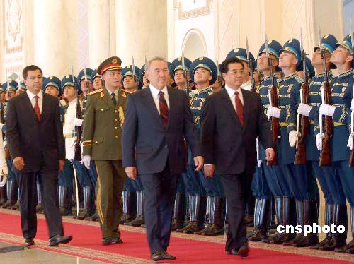 图:纳扎尔巴耶夫举行仪式欢迎胡锦涛