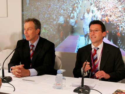 英国首相布莱尔、该国的王室成员以及足球冥想贝克汉姆等抵达新加坡,为伦敦申办2012年奥运会助威。图为伦敦奥神委主席塞博-科伊(Seb Coe)与布莱尔准备接受各国媒体的提问。