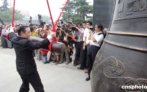 台湾新党主席郁慕明率领的台湾新党“民族之旅”访问团七月八日在南京参观侵华日军南京大屠杀遇难同胞纪念馆时敲响和平大钟。作者:毛建军