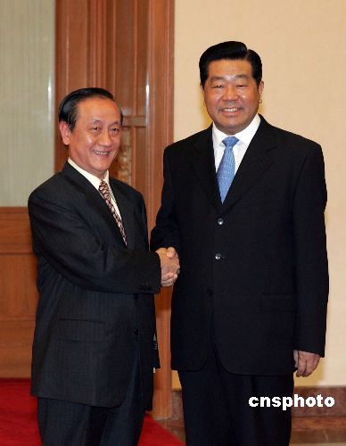 中共中央政治局常委、全国政协主席贾庆林七月十日在北京人民大会堂会见并宴请新党主席郁慕明率领的台湾新党“民族之旅”访问团。作者:毛建军