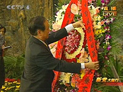 7月11日,新党大陆访问团参观抗日战争纪念馆。图为新党主席郁慕明向抗战纪念馆敬献花圈。(央视截图)