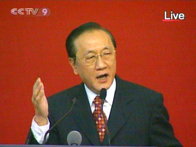 7月12日新党主席郁慕明在中国人民大学逸夫会议中心演讲。(央视截图)
