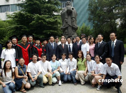 新党主席郁慕明一行与中国人民大学学生们在孔子像前合影。作者:史利