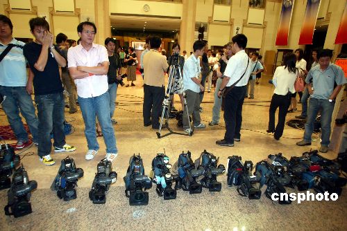 七月十六日晚,中国国民党主席选举揭晓,台北市长马英九高票当选。图为众多媒体在台北国民党中央党部等待新主席露面。作者:盛佳鹏