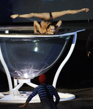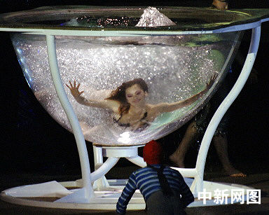 7月16日,2005世界游泳锦标赛在加拿大蒙特利尔开幕。图为开幕仪式上一名游泳者在圆柱形的容器上表演。