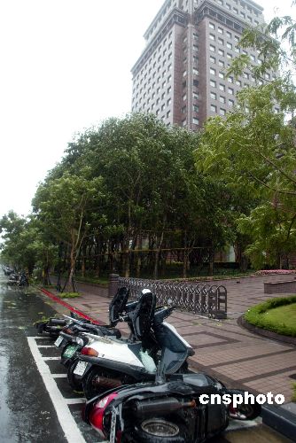 台风笼罩下的台北空旷的街道偶尔有摩托车经过