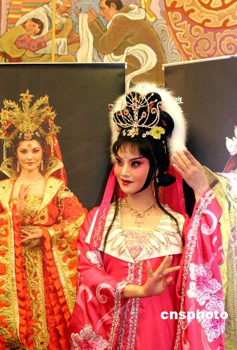 | 中国京剧院与西藏自治区藏剧团联合创办演出的京剧、藏戏《文成公主》,拟于八月二十八日在拉萨举行的西藏自治区成立四十周年庆典活动中首演。藏戏《文成公主》作为八大经典藏剧之一,早已享誉剧坛。此次藏汉联手创排《文成公主》,将在注重京剧、藏戏美学特征的基础上,强调两种戏曲艺术的兼顾与融合,并赋予作品新的时代精神。图为七月十八日在人民大会堂举办的京剧、藏戏《文成公主》新闻发布会上文成公主的扮演者邓敏正在表演该剧的精彩片段。作者:张勤