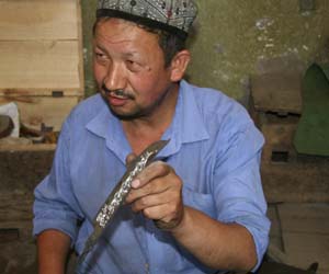 英吉沙小刀久负盛名,小刀厂的工匠会在制作的小刀上刻上自己的名字。