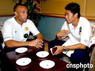 英超豪门曼联队昨日抵达北京,开始他们的中国之行。在未来的几天中,他们将与中国的球迷以及媒体见面,并将与北京现代队进行一场友谊赛。图为中国球员董方卓与法国球星西尔维斯特交谈。