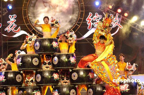第七届中国民间文艺山花奖·民间艺术表演奖,八月六日晚在广东东莞樟木头降下帷幕,云南的《跳菜舞》、广东湛江的《雷州雄师展英姿》、广东东莞的《麒麟戏钱鼓》等十个作品获得优秀作品奖。图为广东东莞樟木头麒麟代表队在闭幕式上表演他们的获奖作品《麒麟戏钱鼓》。作者:罗仰明
