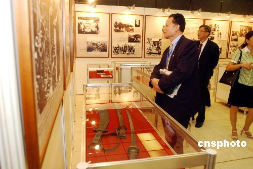 《纪念中国抗战暨世界反法西斯战争胜利六十周年展览》将在8月10日于香港展览中心举行。图为9日布展现场的展品和图片吸引观众。作者:洪少葵