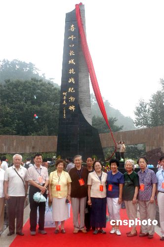 8月12日,“长城抗战纪念碑”揭幕仪式在河北迁西县喜峰口老婆山下举行,以纪念1933年春长城抗战和国民革命军二十九军将士无畏牺牲的民族爱国精神。图为长城抗战将领蒋光鼐之子蒋建国(左一)、赵登禹之女赵学芬(左三〉、佟麟阁之子佟兵(左四〉、李济深之女李筱桐(左五〉丶何基沣之女何玟〈左六〉、于学忠之女于允贤〈左七〉、冯冶安之女冯炳如〈左八),以贵宾身份参加仪式。作者:邹宪