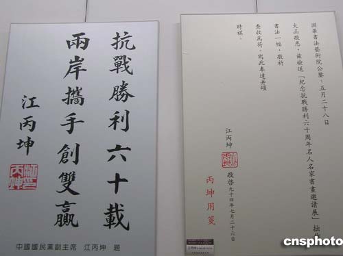 该展览由中国国民党连战主席,书画名家中国书法家协会沈鹏主席分别题写展标,两岸名人名家共同参与。在列展的180多件作品中,既有两岸抗战将军凛凛正气的题词,又有涵盖国际友人以及国内17个省市书画名家精心创作的以抗战题材为主的书画作品。本次展览开展仪式结束后,现场还举行了“两岸携手,共建和谐;勿忘国耻,振兴中华”的万人签名活动。