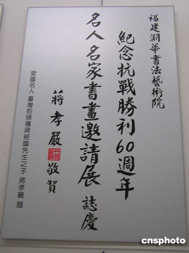 中新网8月14日电 为纪念抗战胜利60周年,弘扬中华儿女爱国主义和革命英雄主义精神,推动祖国和平统一大业,由中国新闻社福建分社、中国华艺广播公司和福建渊华书法艺术院等单位发起,福建省企业与企业家联合会、南昌铁路局、东南沿海铁路福建有限责任公司联合主办的《纪念抗战胜利60周年名人名家书画邀请展》今天上午在福州画院隆重开展。
