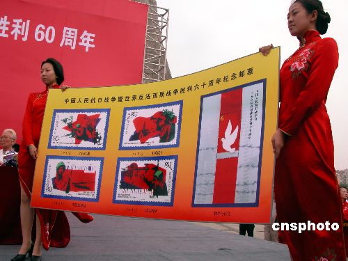 国家邮政局为纪念抗日战争胜利暨世界反法西斯战争胜利60周年,发行纪念邮票一套四枚及小型张一枚。8月15日上午,国家邮政局在沈阳“九·一八”历史博物馆举行了首发式。作者:刘宝成