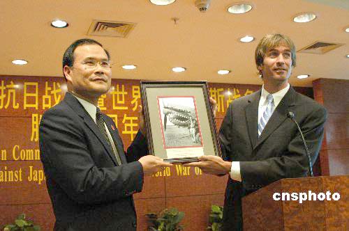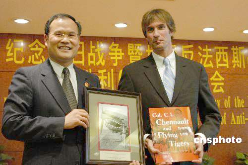 八月十七日,中国驻纽约总领馆举行招待会,纪念抗日战争和世界反法西斯战争胜利六十周年。当年飞虎队的飞行员DONALD LOPEZ委托朋友(右)将其珍贵的历史照片赠与中国驻纽约总领馆总领事刘碧伟(左),刘碧伟回赠中国出版的《陈纳德将军和飞虎队》画册。作者:谭宏伟