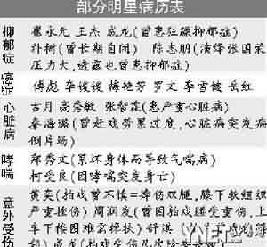 据法制晚报报道,医生和健康专家日前指出,明星们的部分生活方式使他们在精神和体力上普遍呈过劳状态,并对健康造成致命威胁。而且,这些明星高发病同样也威胁着普通人的健康。