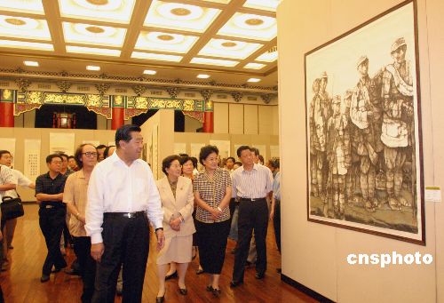 “纪念中国人民抗日战争胜利六十周年美术作品展”八月二十三日在北京全国政协礼堂开幕。全国政协主席贾庆林、全国人大常委会副委员长、民革中央主席何鲁丽等出席开幕式并参观了展览。展览的主题是“以史为鉴,面向未来;毋忘国耻,振兴中华”,展出作品百余幅。作者:张勤