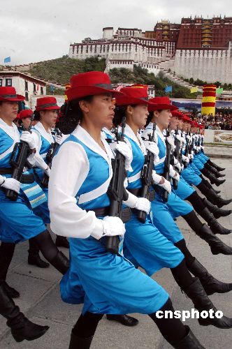 西藏自治区成立四十周年庆祝大会九月一日在拉萨布达拉宫广场举行,西藏各族各界代表组成二十二个表演方队、十八辆彩车游行表演,来自全国各地近二万人参加了庆祝大会。图为西藏女民兵方队经过布达拉宫广场。作者:张宇