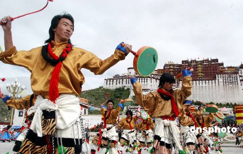西藏自治区成立四十周年庆祝大会九月一日在拉萨布达拉宫广场举行,西藏各族各界代表组成二十二个表演方队、十八辆彩车游行表演,来自全国各地近二万人参加了庆祝大会。图为喜庆的铃鼓舞表演方队经过布达拉宫广场。作者:张宇
