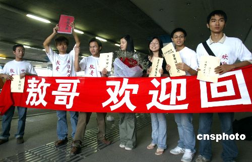 九月十九日晚,台湾知名作家李敖抵达北京,众多“敖之迷”在机场候机厅拉开欢迎条幅。作者:廖文静
