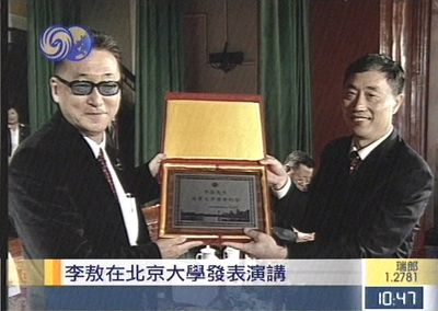 北京大学方面赠送李敖的几件大礼物,包括:演讲纪念牌、李敖父亲当年在北京大学的毕业照片和《儒藏》一书,以及李敖两个姐姐及姐夫在北大读书时的照片。