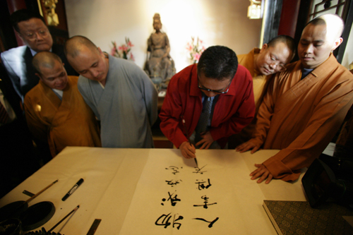 李敖欣然为法源寺留下两幅墨宝:“法海真源,尽在于斯”和“物我两忘,人书俱老”。法源寺方面赠送精装本经书《满汉蒙藏合璧大藏全咒》,八大卷,多达一千多万字。法源寺主持表示,这套书凝结多民族文化精华,涉及不少音乐学内容,希望李敖先生通过此书对民族文化有更多的了解。