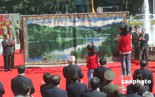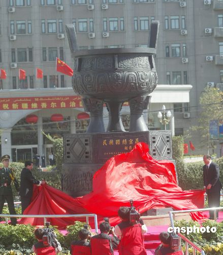 九月三十日,据悉,由胡锦涛总书记题名的“民族团结之鼎”,是中央代表团为庆祝新疆维吾尔自治区成立五十周年向新疆赠送的礼物。作者:史利