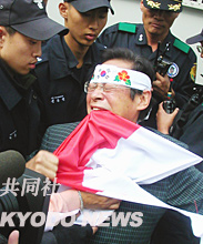 中新网10月17日电 据日本共同社报道,为抗议日本首相小泉纯一郎17日参拜靖国神社,一名韩国男子在日本驻汉城大使馆前撕咬日本国旗,后被警察制止。