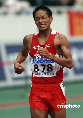 十月二十日,十运会男子五十公里竞走决赛在南京奥体中心开赛,云南老将虞朝鸿以三小时三十六分零六秒的成绩夺得该项目冠军。图为虞朝鸿奋力冲过终点。作者:刘新