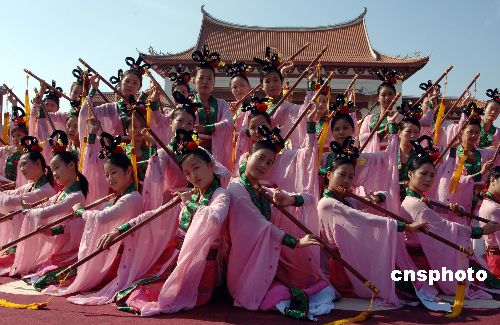 十一月一日,纪念妈祖诞辰1045周年活动在福建莆田湄洲岛隆重举行。图为妈祖祭祀大典中古香古色的乐舞表演。作者:王东明