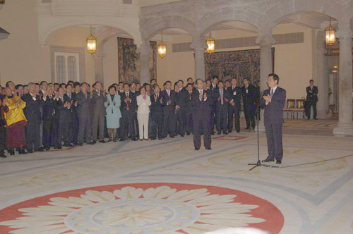 胡锦涛表示,今年以来,中国的国民经济保持了持续平稳较快的发展。他并特别提到,不久前中国成功发射并回收了神舟六号载人飞船。这不仅表明了中国的科技实力、综合实力大大增强,而且也极大地鼓舞了海内外中华儿女为中华民族的振兴而奋斗的信心和斗志。他介绍说,中共十六届五中全会通过了关于国民经济和社会发展第十一个五年规划的建设,明确提出了“十一五”时期经济社会发展的指导思想、重要原则、主要目标和重要措施。他说,我们强调要坚持以人为本,全面协调可持续的科学发展观,要加快调整经济结构,转变经济增长方式,提高自主创新能力,推动区域城乡的协调发展,要继续深化改革开放,实现经济建设、政治建设和文化建设的全面发展。