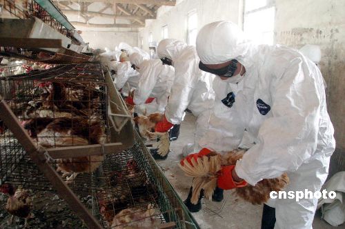 11月17日,山东济南举行防控高致病性禽流感应急模拟演练。来自畜牧、卫生、武警等相关部门的人员进行了封锁疫区、设立消毒检查站、扑杀疫点疫区家禽、消毒灭源、无害化处理等内容的演练。作者:龚辉