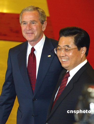 胡锦涛表示,代表中国政府和中国人民对布什来访表示热烈欢迎。他说,两个月前,我们在纽约进行了很好的会晤,刚才我们又在小范围进行了深入的交谈,下面我愿意与总统先生就双边关系和在国际和亚太事务中加强合作的问题进一步交换意见。