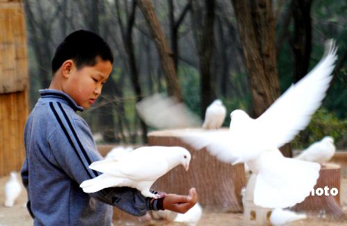 图:市民与接种过禽流感疫苗的鸽子“零距离”