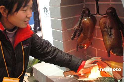 十一月二十五日,由中国全聚德(集团)股份有限公司等单位主办,为期三天的“2005北京国际餐饮、食品博览会”,在北京展览馆开幕,来自德国、法国、日本、澳大利亚、香港、台湾和广州、深圳、北京等地的三百家企业参加了展览。图为一名女青年兴致勃勃地在全聚德烤鸭展区观看烤鸭的样品,虽然世界一些地方发生了禽流感,但人们依然对北京烤鸭情有独衷。作者:邹宪