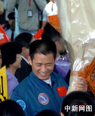27日上午,中国神舟六号载人航天飞行访港代表团抵达香港访问,航天员费俊龙步出机场时受到市民的热烈欢迎。洪少葵 摄