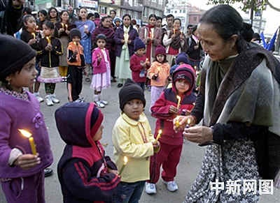 11月30日,Maiti-Nepal主席Anuiradha Koirala(右)为HIV感染儿童分发蜡烛。