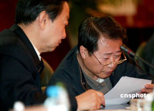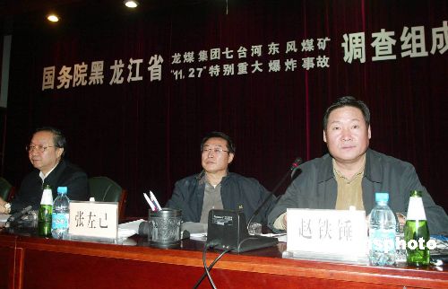 12月1日,国务院黑龙江省龙煤集团七台河东风煤矿“11.27”特别重大爆炸事故调查组在七台河市成立,事故调查工作正式启动。图为事故调查组组长、国家安监局局长李毅中,事故调查组副组长、黑龙江省省长张左己,国家煤矿安全监察局局长赵铁锤(从左至右)等在成立会议上。 作者:武仲林